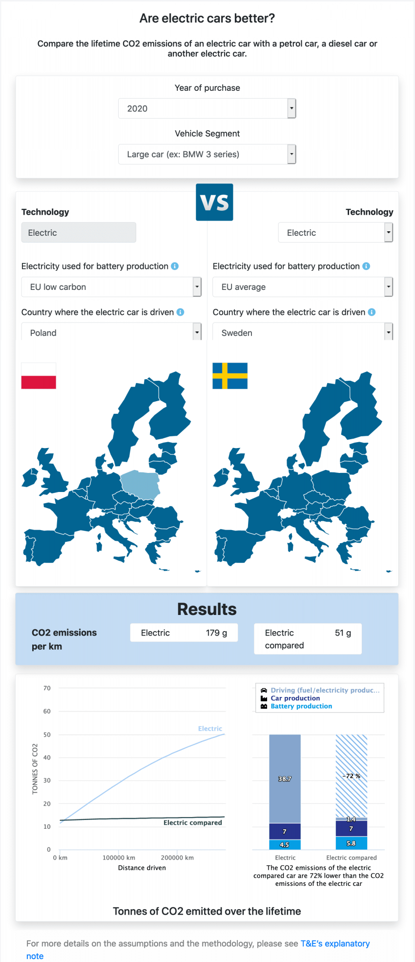 Transport and Environment has also put all this data in to a handy tool that lets you compare CO2 emissions produced by electric, diesel, and petrol cars across different European nations. Check it out below or visit this link to play around with the tool yourself.
