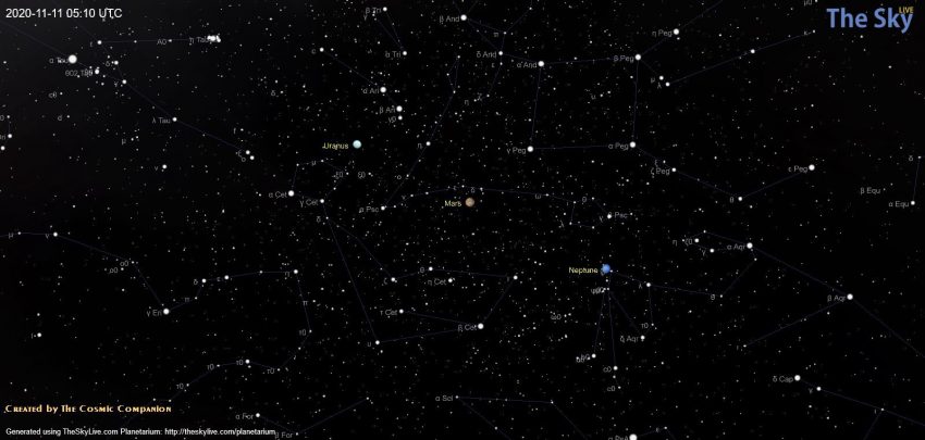 Neptune — dimmer, darker, and harder to find than Uranus, can be seen 11 degrees below, and 31 degrees south (right) of Mars. Finding this planet can present a real challenge for amateur astronomers.