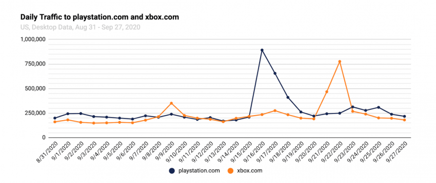 While visits to playstation.com and xbox.com were relatively neck and neck in the lead-up to each brand’s pre-order launch dates, traffic to PlayStation‘s site peaked at a little over 892,000 on September 16 when Sony kicked off pre-orders for its next-gen console. By contrast, Xbox‘s site topped out at 776,200 visits on its respective pre-order launch on September 22.