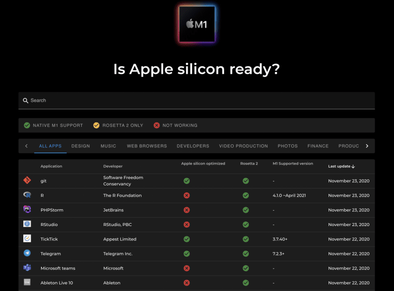 As exciting as the M1 chip and all its speed is, it’s pretty pointless for you to run and grab a machine if the software you use for work isn’t supported. In this environment, a site like this that shows you simply if your favorite apps work on Apple Silicon is worth its weight in gold. (Yeah, technically, the website doesn’t really weigh anything, but you get what I’m sauying).