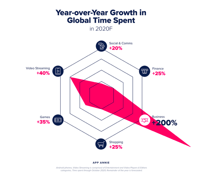 App Annie observed that due to the pandemic and work-from-home culture, users spend twice as much time on business apps this year than compared to the last. The trend might continue in 2021 as workplaces will continue to opt for remote work despite the potential availability of vaccines