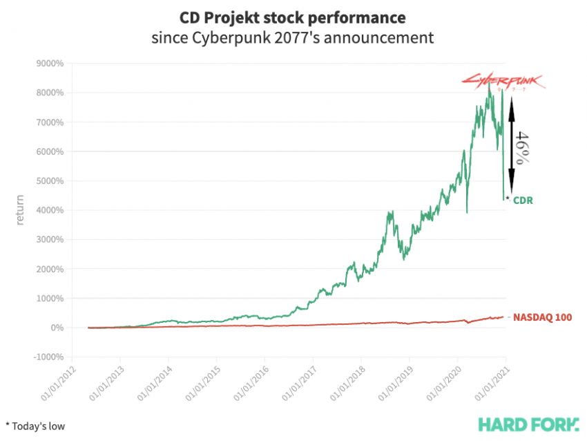 Still, despite nearly halving in just six trading days, CDR stock is still up more than 4,300% since it first announced Cyberpunk 2077 in May 2012.