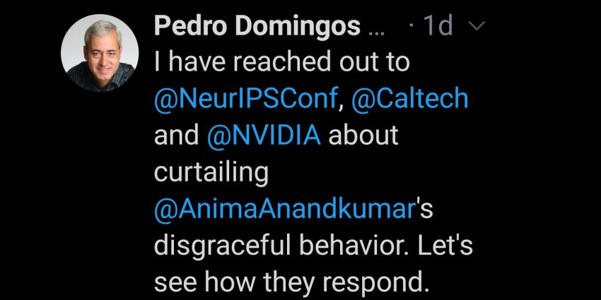 So it’s hilariously ironic that Pedro Domingos is currently engaged in a campaign to get Anandkumar fired for being mean to him on Twitter.