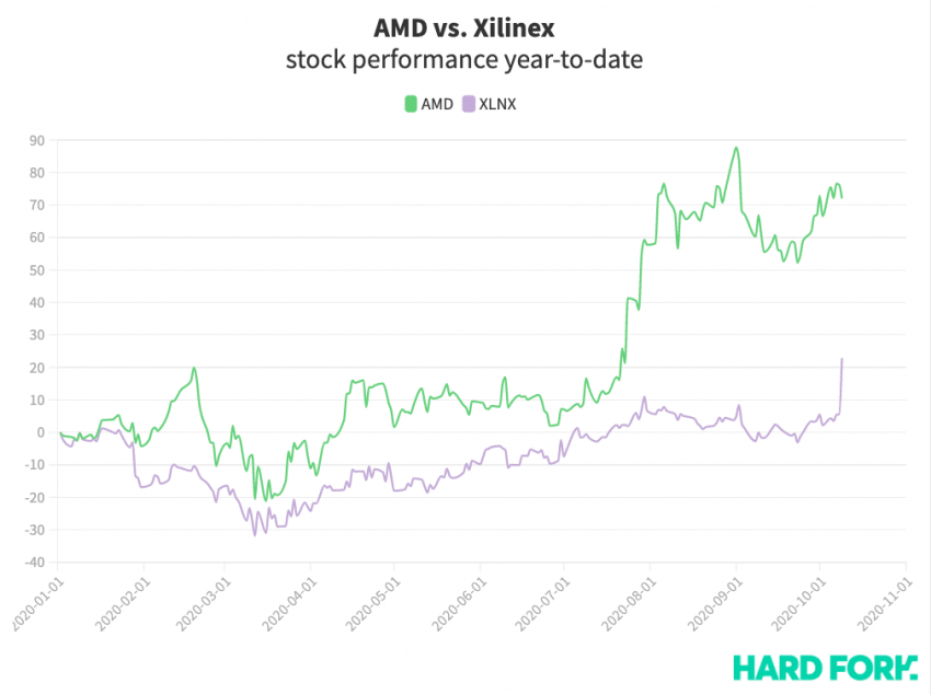 Until now, XLNX had returned just 5% in 2020 (just a touch more than the S&P 500). AMD stock, on the other hand, fell 4% — but it’s still up more than 70% year-to-date.