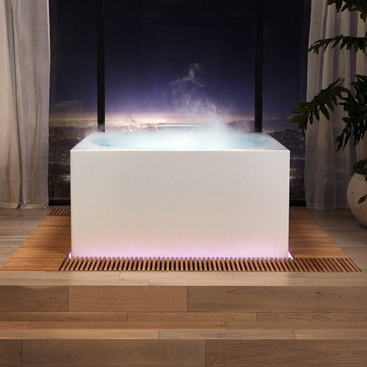 The tub is super minimalistic and comes with wooden grates around it to absorb the outflowing water. Those wooden grates also help in creating a soothing sound. Plus, “the experience tower,” lets your manage lighting, create a fog, and add essential oils to make your bath better. The tub also supports voice assistant commands to let you set the water temperature and autofill the tub to the specified level.