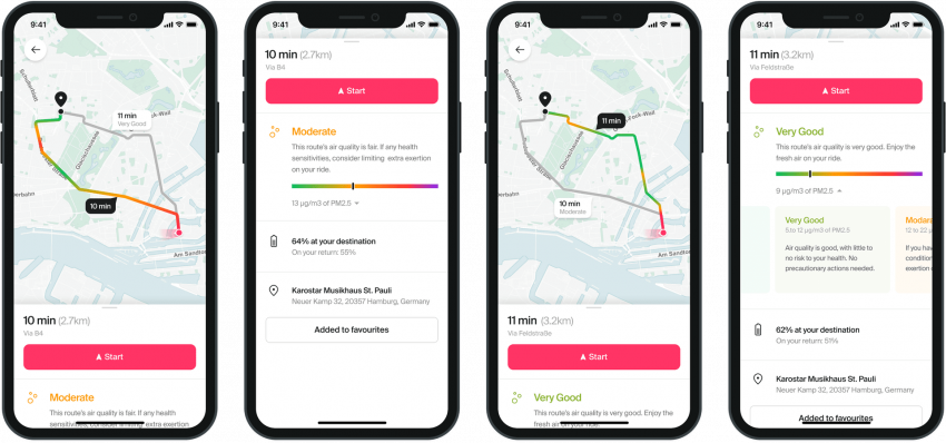 In the latest update of its app — out this week — Cowboy has added a navigation feature which allows riders to plan their routes based on air quality.