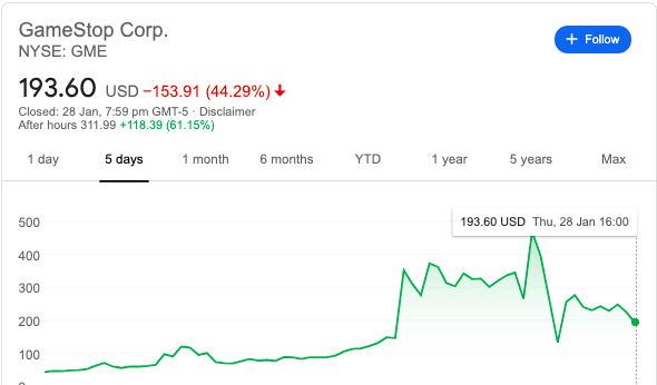 Then other investors from YouTube and TikTok joined in and created a “short squeeze” to increase the GameStop stock price. It’s been a roller coaster ride for this stock, which has gone as high as $469 and as low as $132 in one week.