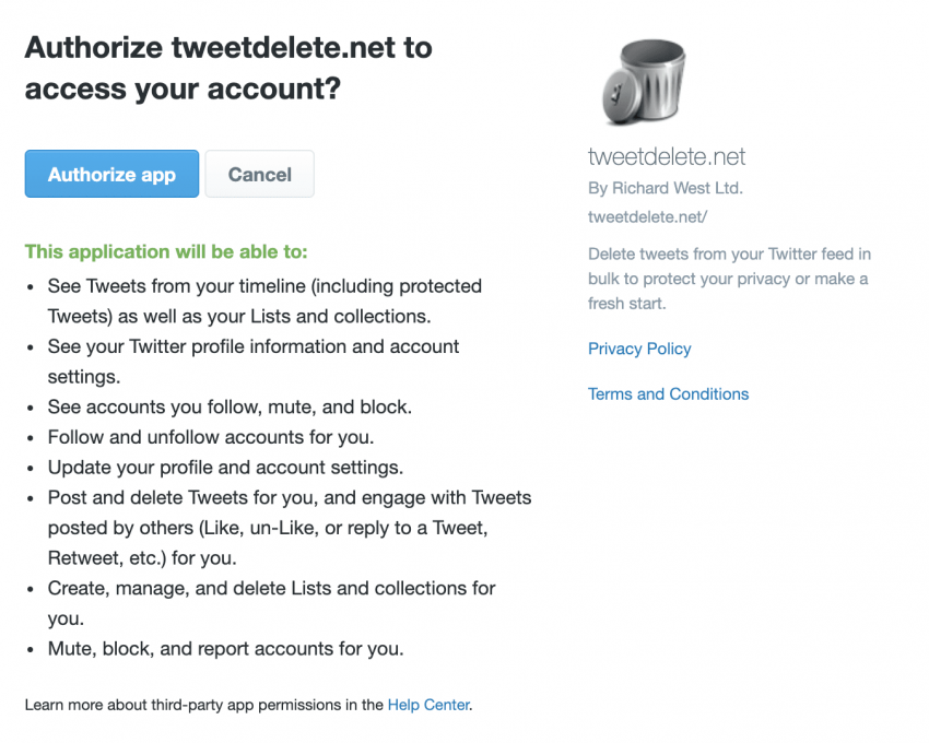 - Click “Authorize app” (the permissions list is the same as on TweetDelete).