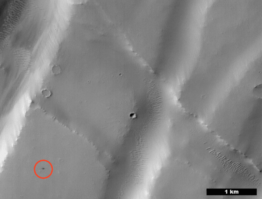 The cluster it detected was created by several pieces of a single meteor, which had shattered into pieces while flying through the Martian sky at some point between March 2010 and May 2012. The fragments landed in a region called Noctis Fossae, a long, narrow, shallow depression on Mars. They left behind a series of craters spanning about 100 feet (30 meters) of the planet’s surface.