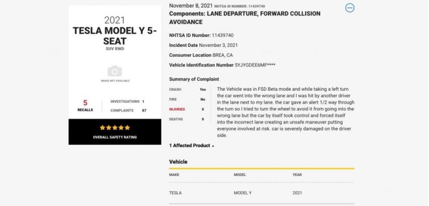 An anonymous owner of a 2021 Tesla Model Y has filed a complaint at the National Highway Traffic Safety Administration (NHTSA), reporting their vehicle crashed while the Full Self-Driving Beta was engaged.