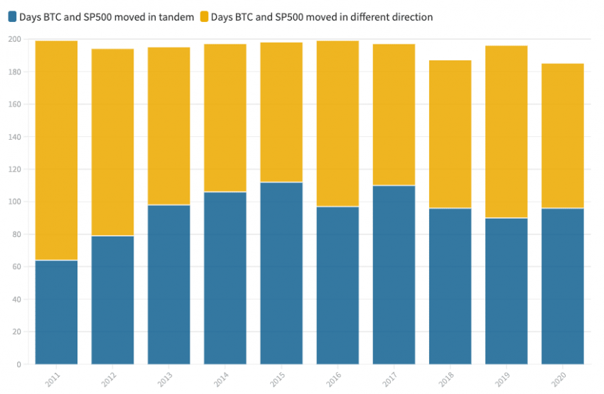 First, let’s see how differently Bitcoin has behaved on a day-to-day basis, compared to the S&P 500. To figure that out, we checked how often Bitcoin’s price went up when on a stock market trading day the S&P 500 also went up, and how often Bitcoin’s price moved down in tandem with the S&P 500. The remainder are the days in which Bitcoin went in another direction. Below, you can see the number of days per year for the last ten years in which they moved in tandem blue) or not (yellow).