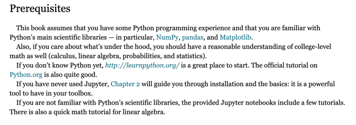 - Python libraries: Python machine learning books usually use ScikitLearn (and sometimes SciPy) to implement algorithms. Books on deep learning cover TensorFlow, Keras, and PyTorch. But these books also make use of scientific libraries such as Numpy, Pandas, and Matplotlib to load and manipulate data. Some books will cover these libraries while others will tell you that you should already have experience with them. (To be clear, these libraries have dedicated books that span several hundred pages.)